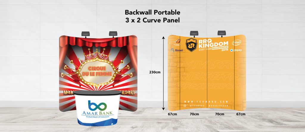 Backwall 3×2 Curve Panel adalah sistem backdrop modular dengan bentuk lengkung (Curve) yang memberikan tampilan bersih dan profesional. Cocok untuk berbagai keperluan promosi, seperti :